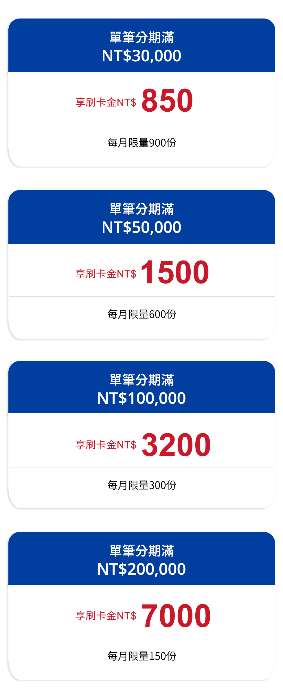- 本活動限於指定旅行社刷星展信用卡分期消費達指定門檻,並於指定期間內完成登錄(限正卡持卡人登錄),即可參加本活動。本活動正附卡消費合併計算,當月消費須當月登錄 (月月消費、始得月月皆享回饋),每月每一正卡持卡人(以身分證字號歸戶)限擇優回饋乙次,每月最高回饋NT$7,000,恕不跨門檻重複回饋。