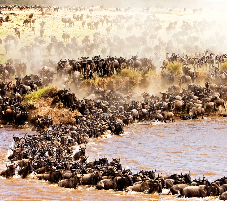 超過100萬頭牛羚、50萬頭斑馬和35萬頭瞪羚,一齊從坦尚尼亞穿越肯亞。隊伍前鋒是斑馬,牠們愛吃長草,而吃剩的長草底部,則留給後方的牛羚,草被吃光後,新生嫩草正是後頭瞪羚的最愛!享受完草原,將再遷徙它方,形成新一輪的生命循環。