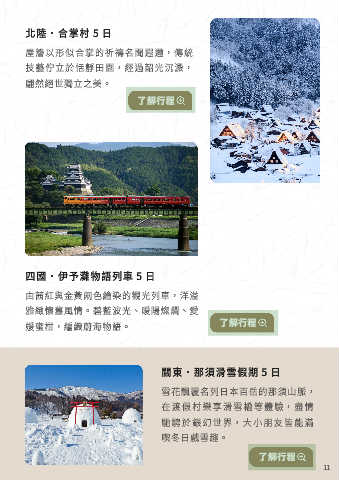 北陸.合掌村 5 日 屋簷以形似合掌的祈禱名聞遐邇,傳統 技藝佇立於恬靜田園,經過韶光沉澱, 翩然絕世獨立之美。 了解行程 四國.伊予灘物語列車 5 日 由茜紅與金黃兩色繪染的觀光列車,洋溢 雅緻懷舊風情。碧藍波光、暖陽燦爛、愛 了解行程 媛蜜柑,編織蔚海物語。 關東.那須滑雪假期 5 日 雪花飄覆名列日本百岳的那須山脈, 在渡假村樂享滑雪橇等體驗,盡情 馳騁於銀幻世界,大小朋友皆能滿 喫冬日戲雪趣。 了解行程 11