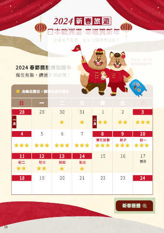 2024 春節旅遊月曆 加大塊、利小狐 攜手陪您過好年 2024 春節團陸續加開中 機位有限,請提早規劃喔! 尖峰出團日,請務必盡早報名 日 一 二 三 四 五 六 28 29 30 31 1 2 3 月 一 月 二 4 5 6 7 8 9 10 彈性放假 除夕 初一 11 12 13 14 15 16 17 初二 初三 初四 初五 補班 18 19 20 21 22 23 24 新春團體 18