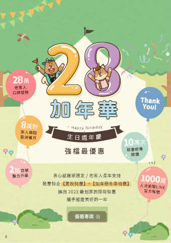 28 加年華:生日周年慶,強檔最優惠 衷心感謝新朋友 / 老客人長年支持 隆重特企【夏秋特惠】+【加年華冬季特惠】 擁抱 2023 最划算的限時特惠 攜手遨遊美好的一年 優惠專案 8