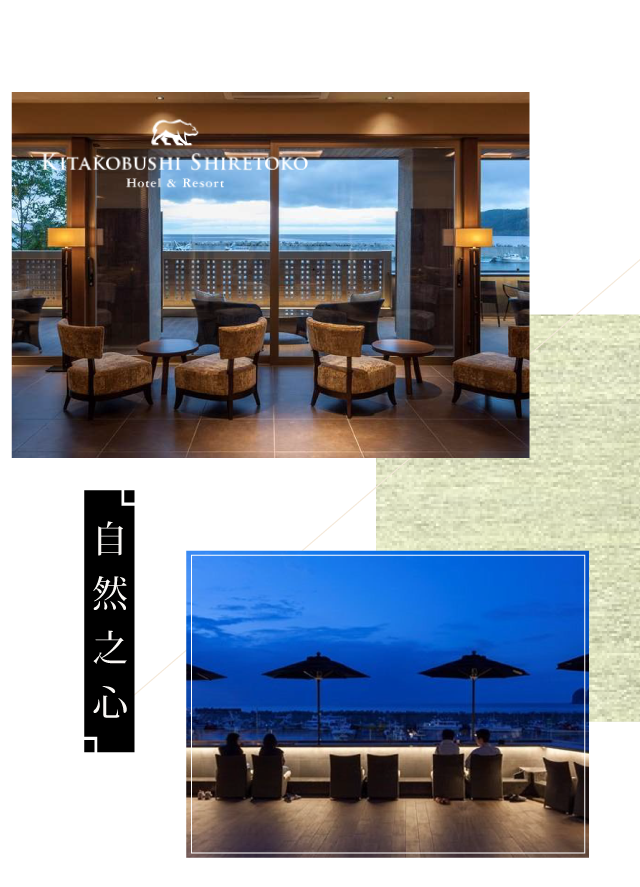 以「知床北辛夷」的地方特色為設計理念,飯店大堂選用傳統木材,製作鹿角裝飾、狐桃色家具等,地毯花紋更繪飾知床五湖的優美景緻,打造舒適而自然的休憩空間。