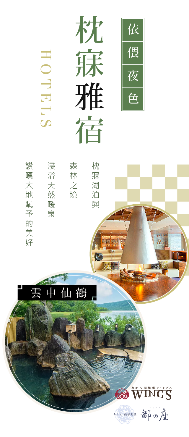 如同丹頂鶴在北海道文化中的祥瑞意義,鶴雅集團以高雅與獨特為傲。靜心感受和洋折衷的風雅情調,悠賞阿寒湖山水風光,泉質柔潤的溫泉讓您療癒身心。