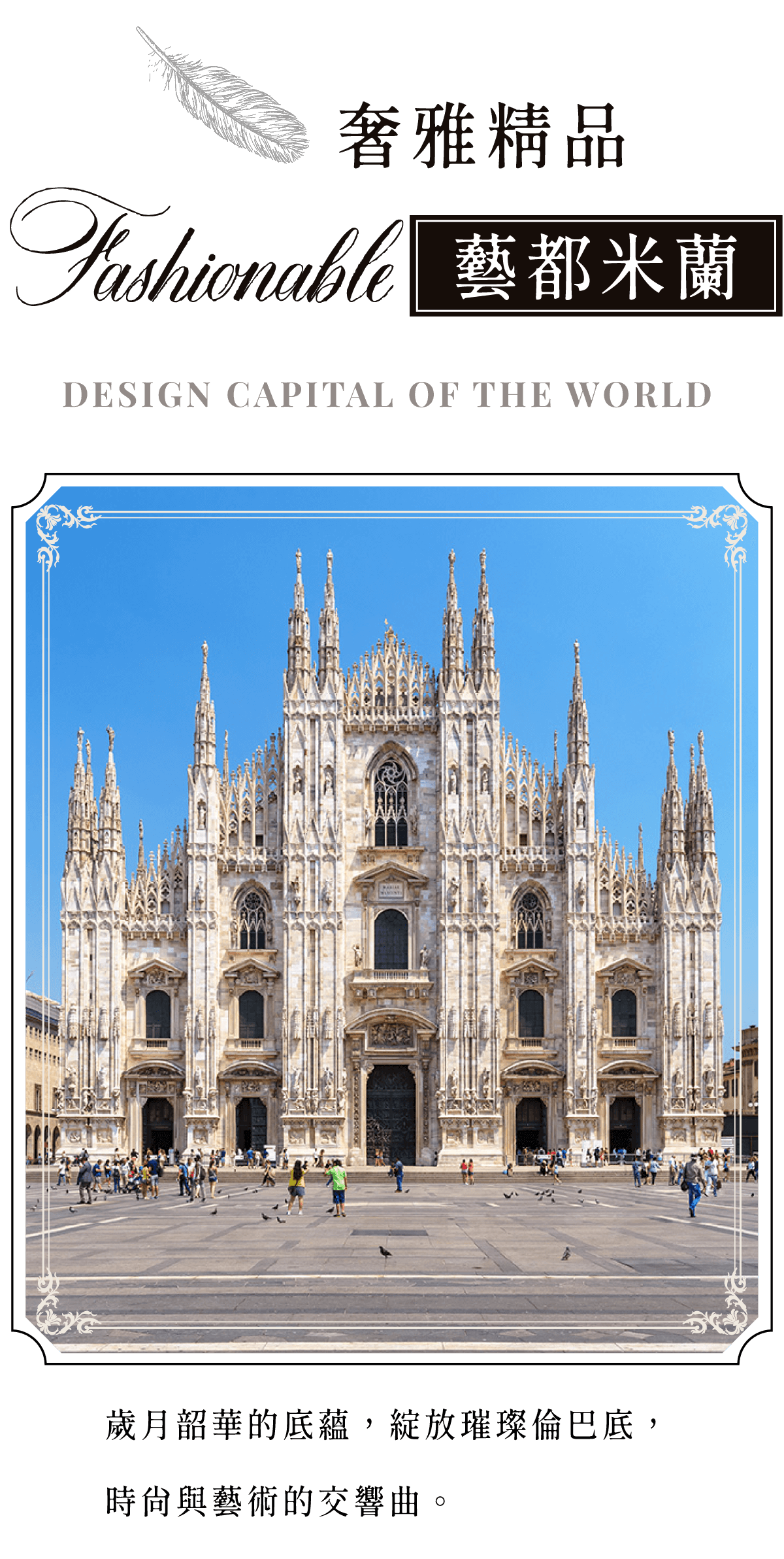 米蘭的市標-米蘭大教堂為世界第三大教堂,有「大理石的詩篇」之美稱。十字形的▲艾曼紐二世迴廊是米蘭最繁華鬧區,高級餐廳與精品名店各式林立,儼然是米蘭的時尚伸展台。