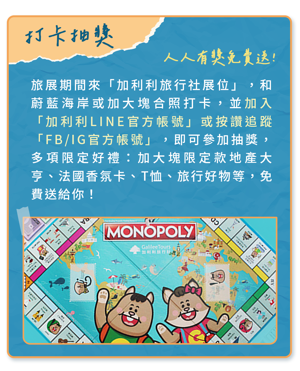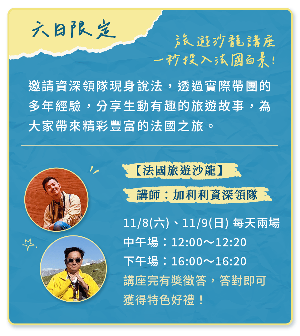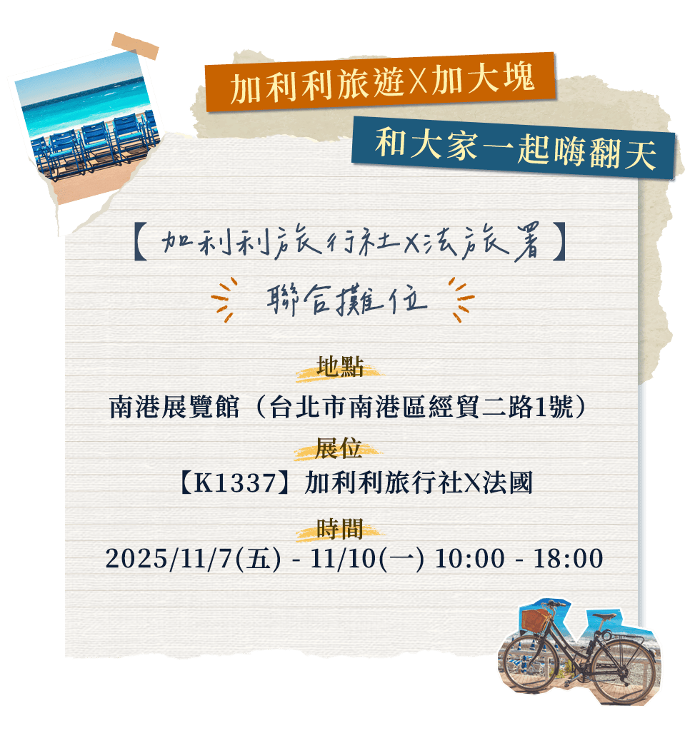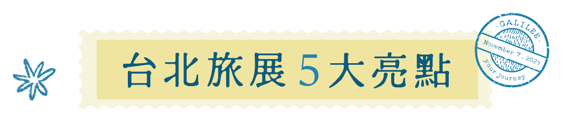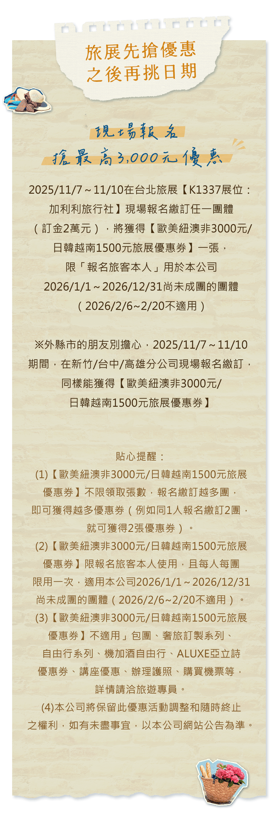 2025/11/7~11/10在台北旅展【K1337展位:加利利旅行社】,現場報名繳訂任一團體(訂金2萬元), 將獲得【歐美紐澳非3000元/日韓越南1500元旅展優惠券】一張,限「報名旅客本人」