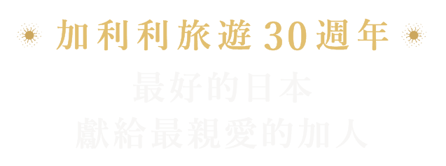 承蒙加人們的厚愛,2026年加利利旅遊迎來「30週年」輝煌里程碑, 為了回饋這份情誼與加人之絆,我們的「日本全新改版」, 將多年來的款待心法重新洗鍊,規劃「初見日本、星曜日本、奢藏日本」三大系列, 向加人致上最深的謝意,把最好的日本,呈獻給最親的加人。