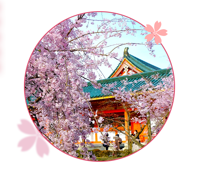 京都晚櫻的代表性絕景,枝垂櫻如雲霞般披垂池畔,映襯朱紅鳥居與殿宇建築,為天地塗抹濃郁飽滿的艷麗筆觸。