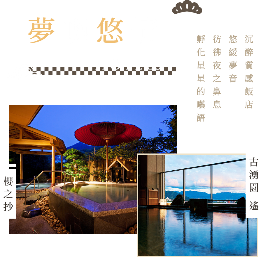 曾列「百選溫泉飯店」四國地區排行第一,和洋式的夢宿客室,散發明淨洗鍊的日式居家風格。浸身療癒湯泉,飽覽四季幻化的季節麗景,尊享閒適自在的美好假期。