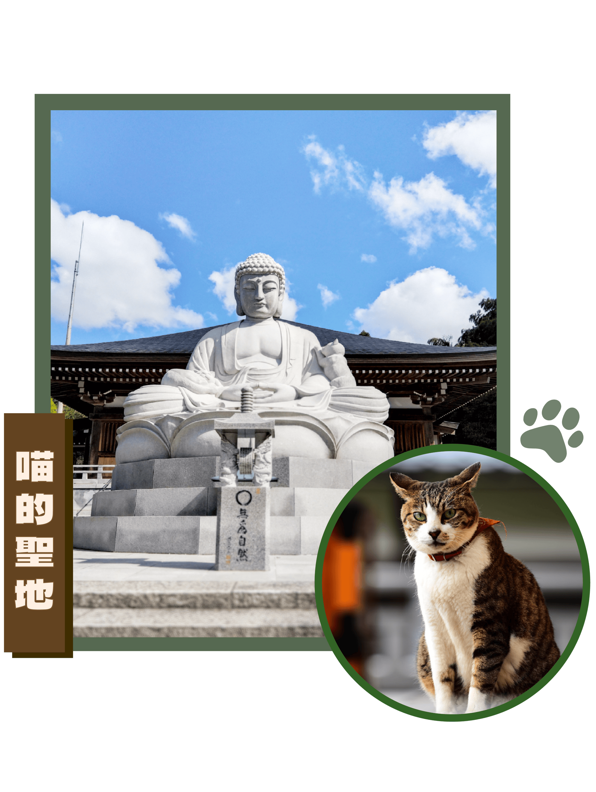 大受貓奴歡迎的「貓寺」,7公尺高的「貓大佛」石像流露慈悲,約30隻貓咪在暖陽下舒展身軀,呼嚕聲伴隨晨鐘與暮鼓,療癒眾生。