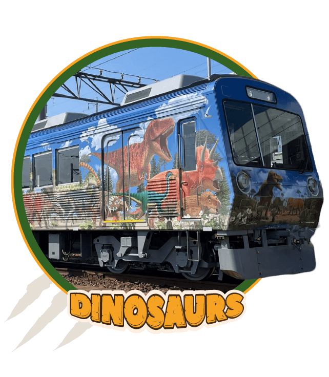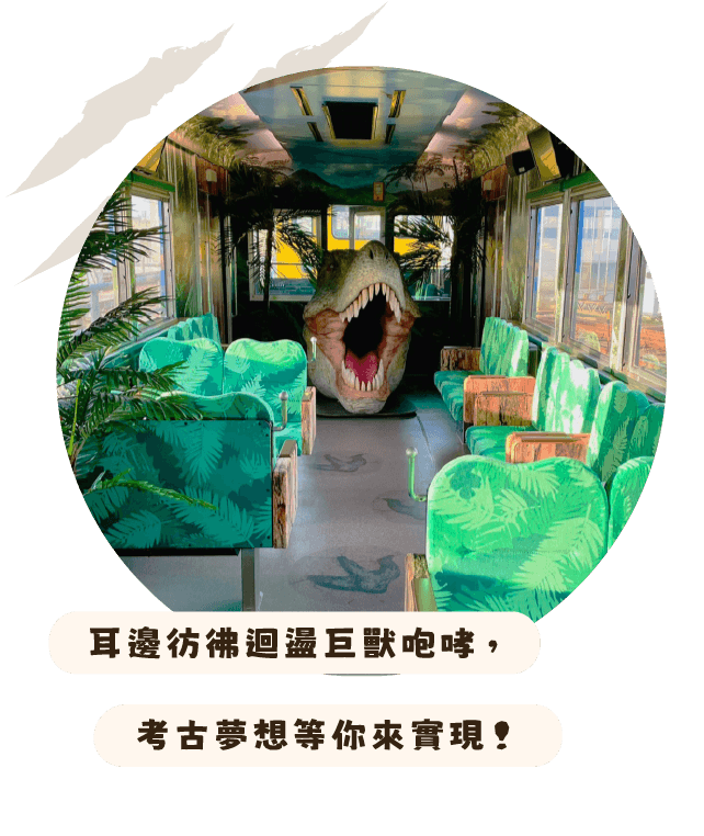 化身恐龍博士踏上考古之旅,列車裝潢宛如侏儸紀公園研究室,叢林佈景與立體恐龍模型令人興奮不已,鐵道軌跡翻轉為荒野獵場。
