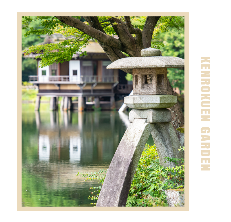 日本三大名園之首,演繹金澤加賀百萬石文化。綠意盎然,草木與亭台水波醞釀麗緻色澤。