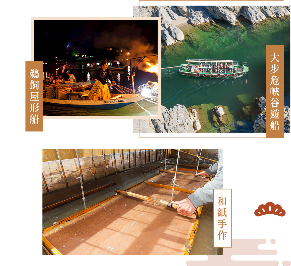 乘著微風輕拂的屋形船,觀賞鵜匠職人指揮鸕鶿捕魚,在火光與水色的輝映下,交織深刻的夏夜流光。