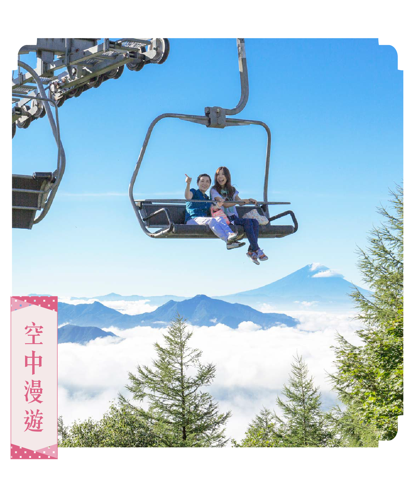 搭乘開放式設計的纜椅,一邊緩緩爬升、一邊飽覽山林的季節詩篇,最後抵達海拔1,900 公尺的展望台。