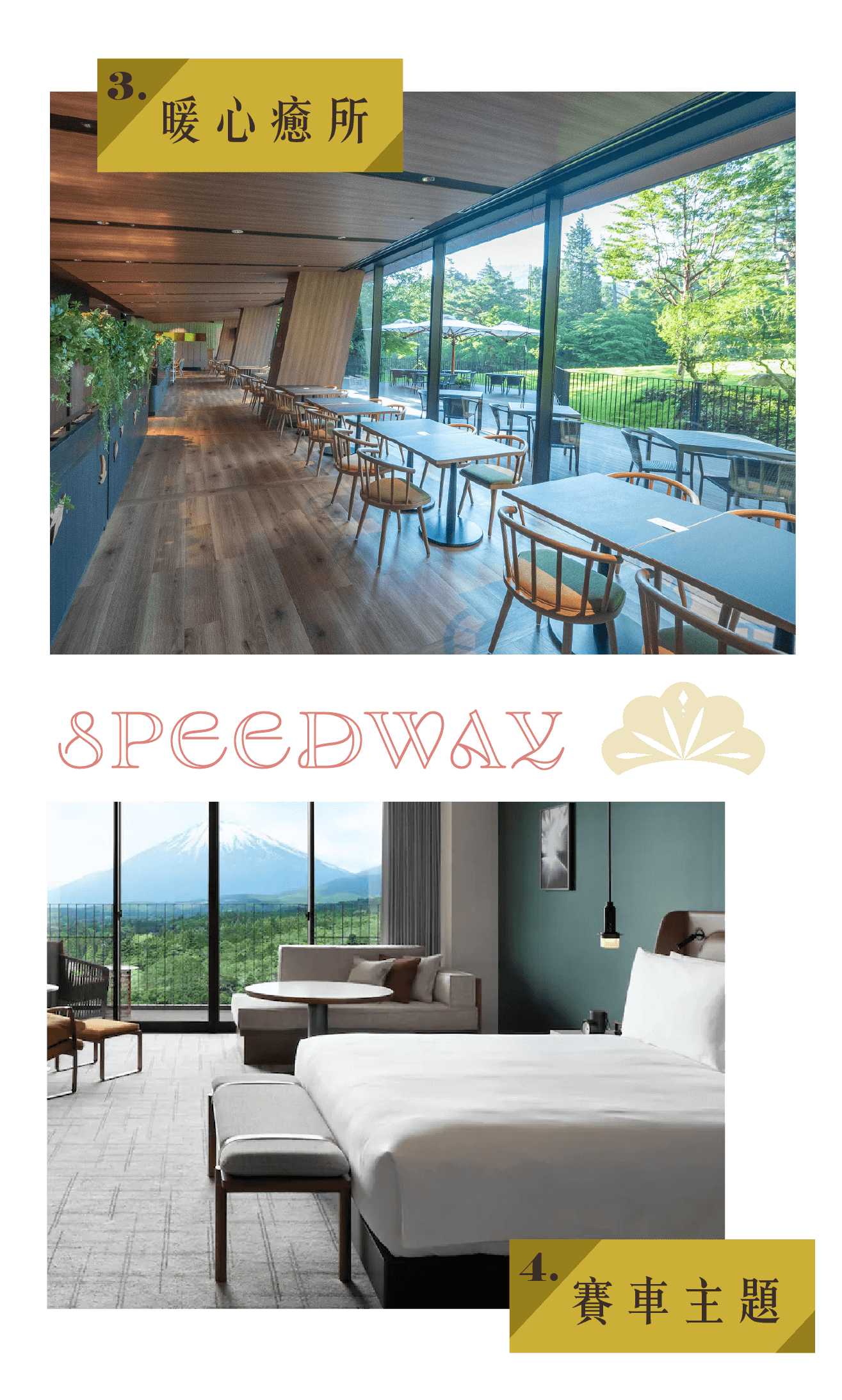 結合創意與歷史文化,「凱悅臻選品牌」改建日本第一場F1大賽的場地,2022年打造出一棟賽車主題的奢美飯店。飯店擁享賽車場與富士絕景,傲展渡假勝地的輕奢魅力。