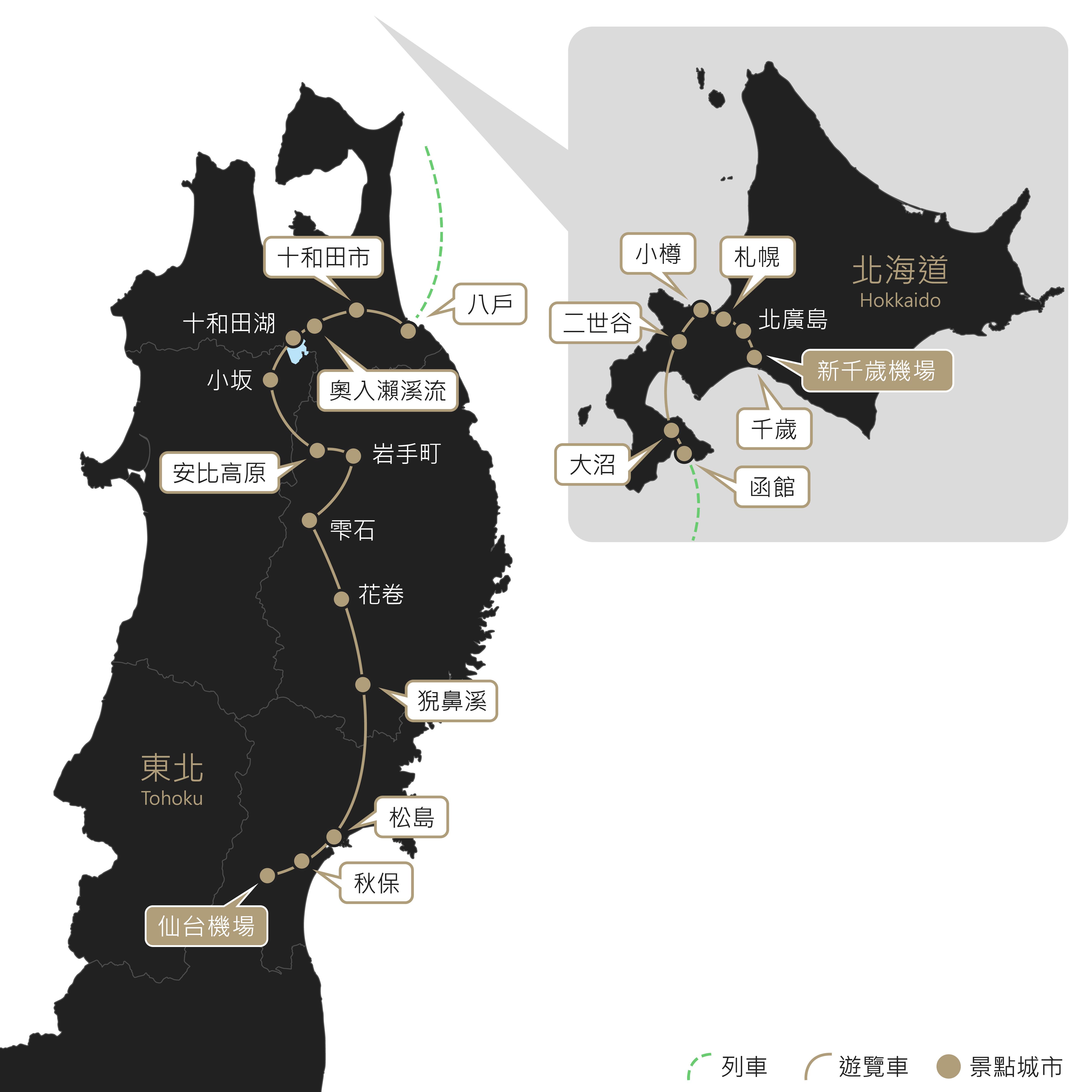 安比高原-小坂*鐵道腳踏車*-十和田湖*展望台*-奧入瀨溪流(或鰺澤溫泉)